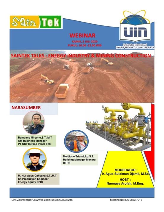 Saintek News (2/7/2020) - Fakultas Sains dan Teknologi UIN Jakarta mengadakan Kuliah Umum daring dengan tema Saintek Talks: Energy Industry and Mining Construction pada Kamis, 2 Juli 2020 pagi menggunakan aplikasi Zoom. Acara yang dipandu oleh Host Nurmaya Arofah ini dibuka oleh Wakil Dekan Bidang Akademik Nashrul Hakiem dengan menghadirkan tiga narasumber yaitu M. Nur Agus Cahyana, Meidiono Triandoko, dan Bambang Niryono.