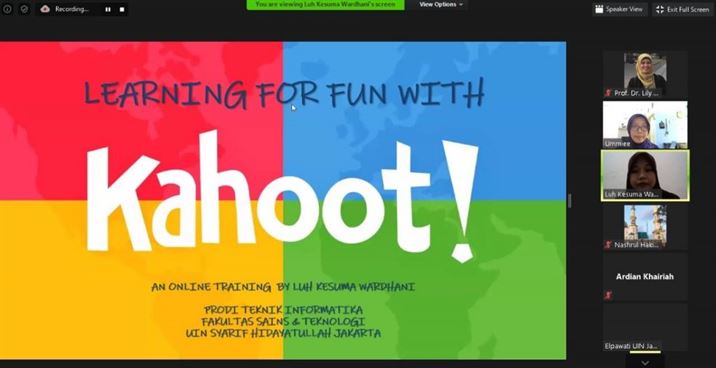 Workshop ini dimoderatori oleh Siti Ummi Masruroh dan dibuka langsung oleh Dekan FST Lily Surayya Eka Putri. Pemaparan dimulai dengan penjelasan oleh narasumber Luh Kesuma Wardhani secara menarik mengenai fitur-fitur Kahoot dilanjutkan dengan penjelasan penggunaannya yang langsung dipraktekkan. Para peserta pun dipersilahkan untuk mencoba langsung permainan kuis di Kahoot agar peserta dapat secara langsung mendapatkan pengalaman bermain Kahoot yang menarik.