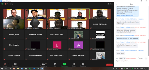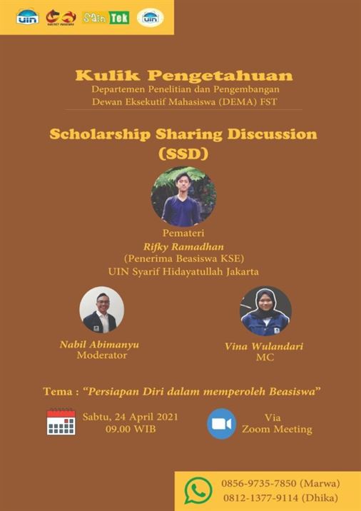 Saintek News (24/04/2021) Departemen Penelitian dan Pengembangan Dewan Eksekutif Mahasiswa Fakultas Sains dan Teknologi (DEMA FST) menyelenggarakan Acara Kulik Pengetahuan (Scholarship Sharing Discussion) yang memiliki tema “Persiapan Diri dalam Memperoleh Beasiswa” dengan konsep acara Forum Group Discussion. Acara ini dilaksanakan pada Hari Sabtu, 24 April 2021 dari pukul 09.00 s/d 12.10 WIB. Acara ini mengundang pemateri dari Mahasiswa UIN Sarif Hidayatullah yaitu Rifky Ramadhan yang notabene selaku penerima Beasiswa Karya Salemba Empat.